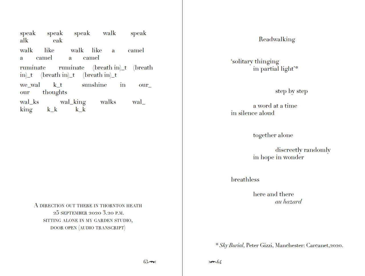 A direction out there, readwalking with Thoreau (MA BIBLIOTHEQUE, 2021) brings together a prepared text, a text score and essays by Michael Hampton and Vicky Smith.