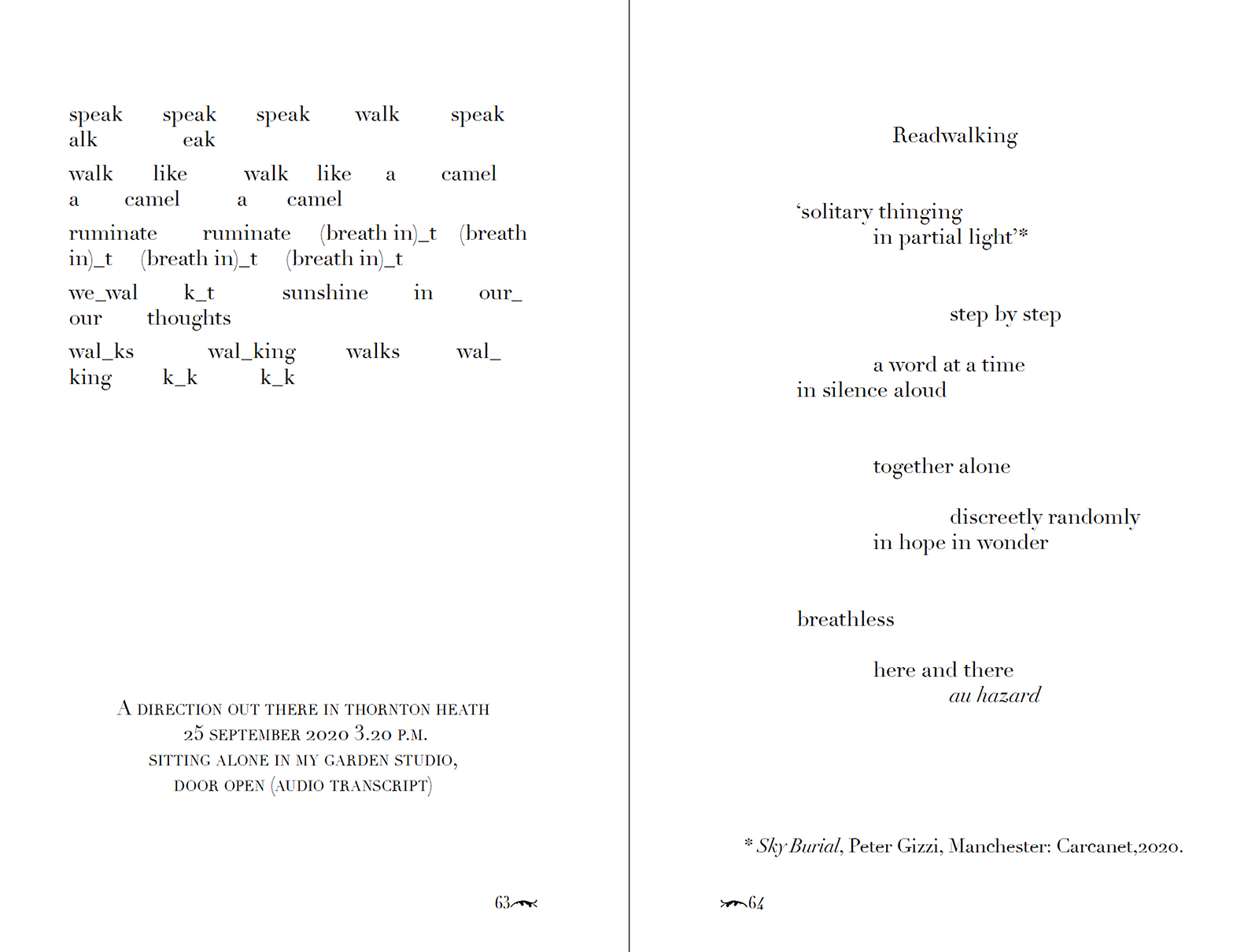 The open score is based on a radical pruning of David Henri Thoreau’s transcendental essay about walking (1851). Footnotes provide suggestions on how to speak, sing, sound the remaining words, alone or with others, inside or outside.